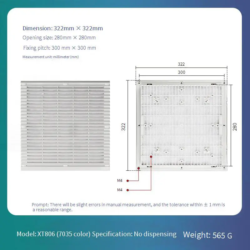Mes siūlome lengvai prižiūrimą aušinimo ventiliatoriaus dulkių dangtelį. Produktas gali užtikrinti ilgalaikį stabilų aušinimo sistemos veikimą, tinkamą pramoninei įrangai, elektroninėms spintelėms, kompiuterių pagrindiniams kompiuteriams, telekomunikacijų bazinėms stotyse ir kitiems scenarijams.