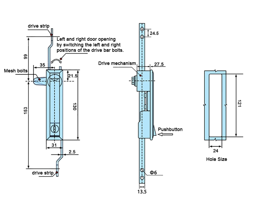 Nerūdijančio plieno durų užraktas yra pagamintas iš nerūdijančio plieno originalios nerūdijančio plieno spalvos, kad būtų patvarumas ir atsparumas korozijai. Atidarymo dydis yra 24 mm × 121 mm, užtikrinantis suderinamumą su standartinėmis diegimo konfigūracijomis.
