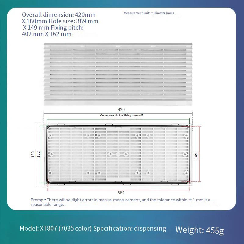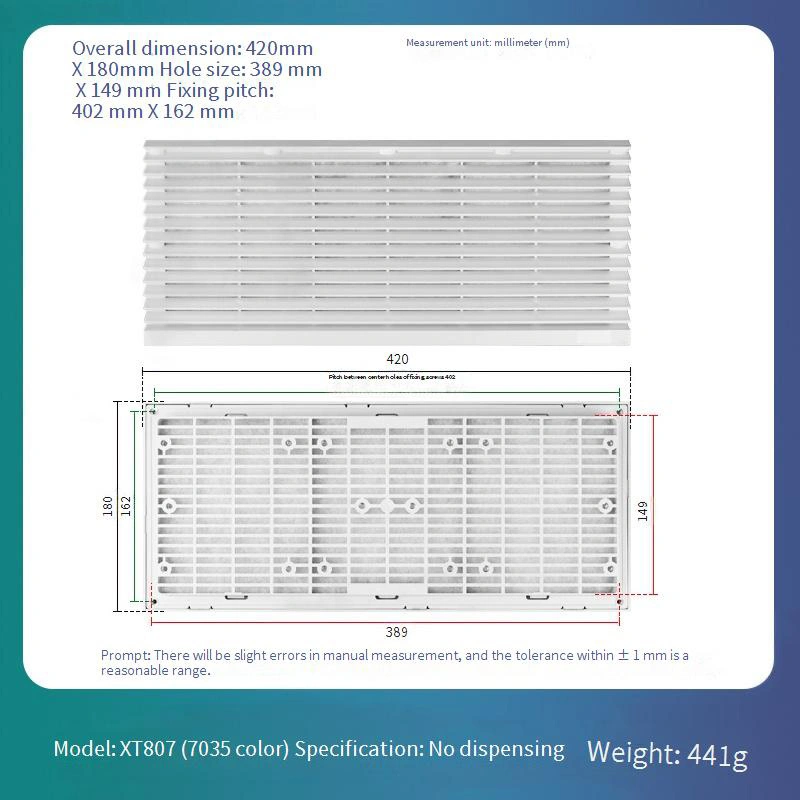 Turi keičiamą filtro tinklo dizainą, kad būtų lengva prižiūrėti ir pakeisti, žymiai sumažinant ilgalaikes eksploatavimo išlaidas. Rėmo struktūra yra standartine „White-Gray 7035“ spalva. Jis sukonstruotas iš ABS medžiagos, siūlančios puikų atsparumą deformacijai, užtikrinant ilgalaikį stabilumą.